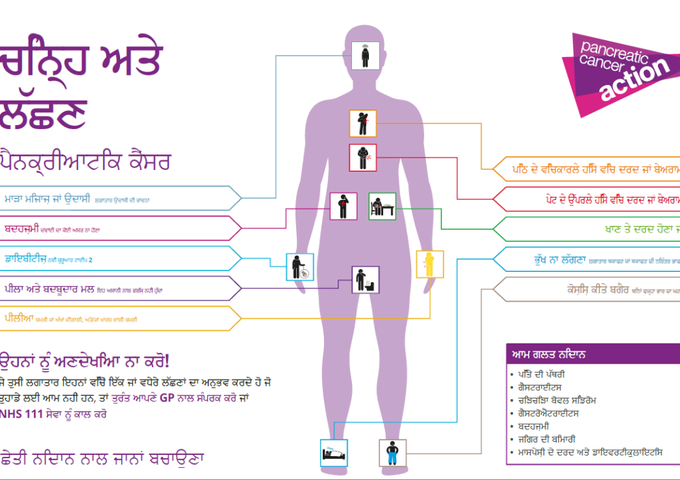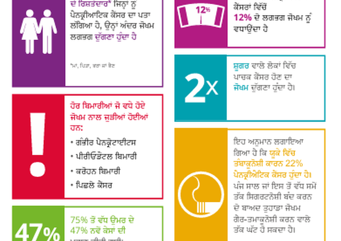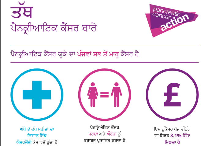 ਕਿਰਪਾ ਕਰਕੇ ਉਨ੍ਹਾਂ ਬਾਰੇ ਜਾਣਨ ਲਈ ਕੁਝ ਸਮਾਂ ਨਿਕਾਲੋ। ਪੈਨਕ੍ਰੀਆਟਿਕ ਕੈਂਸਰ ਦੀ ਯੂਕੇ ਦੇ ਸਾਰੇ 22 ਸਭ ਤੋਂ ਆਮ ਕੈਂਸਰਾਂ ਵਿੱਚੋਂ 5 ਸਾਲਾਂ ਦੀ ਬਚਣ ਦੀ ਦਰ ਸਭ ਤੋਂ ਘੱਟ ਹੈ, ਮੁੱਖ ਤੌਰ ਤੇ ਦੇਰ ਨਾਲ ਤਸ਼ਖੀਸ ਦੇ ਕਾਰਨ।. ਪੈਨਕ੍ਰੀਆਟਿਕ ਕੈਂਸਰ ਲਈ 5 ਸਾਲਾਂ ਦੀ ਬਚਣ ਦੀ ਦਰ ਇਸ ਸਮੇਂ 7.9% ਹੈ। ਸਾਡੇ ਬਦਲਾਅ ਦੇ ਦਹਾਕੇ ਦੇ ਹਿੱਸੇ ਵਜੋਂ, ਅਸੀਂ ਤੁਹਾਨੂੰ 2030 ਤੱਕ ਇਸ ਨੂੰ 13% ਤੱਕ ਵਧਾਉਣ ਲਈ ਜਾਗਰੂਕਤਾ ਵਧਾਉਣ ਵਿੱਚ ਸਾਡੀ ਮਦਦ ਕਰਨ ਲਈ ਕਹਿ ਰਹੇ ਹਾਂ।. ਸਾਡੇ ਪੰਜਾਬੀ ਭਾਸ਼ਾ ਦੇ ਸਰੋਤ ਵੇਖੋ.